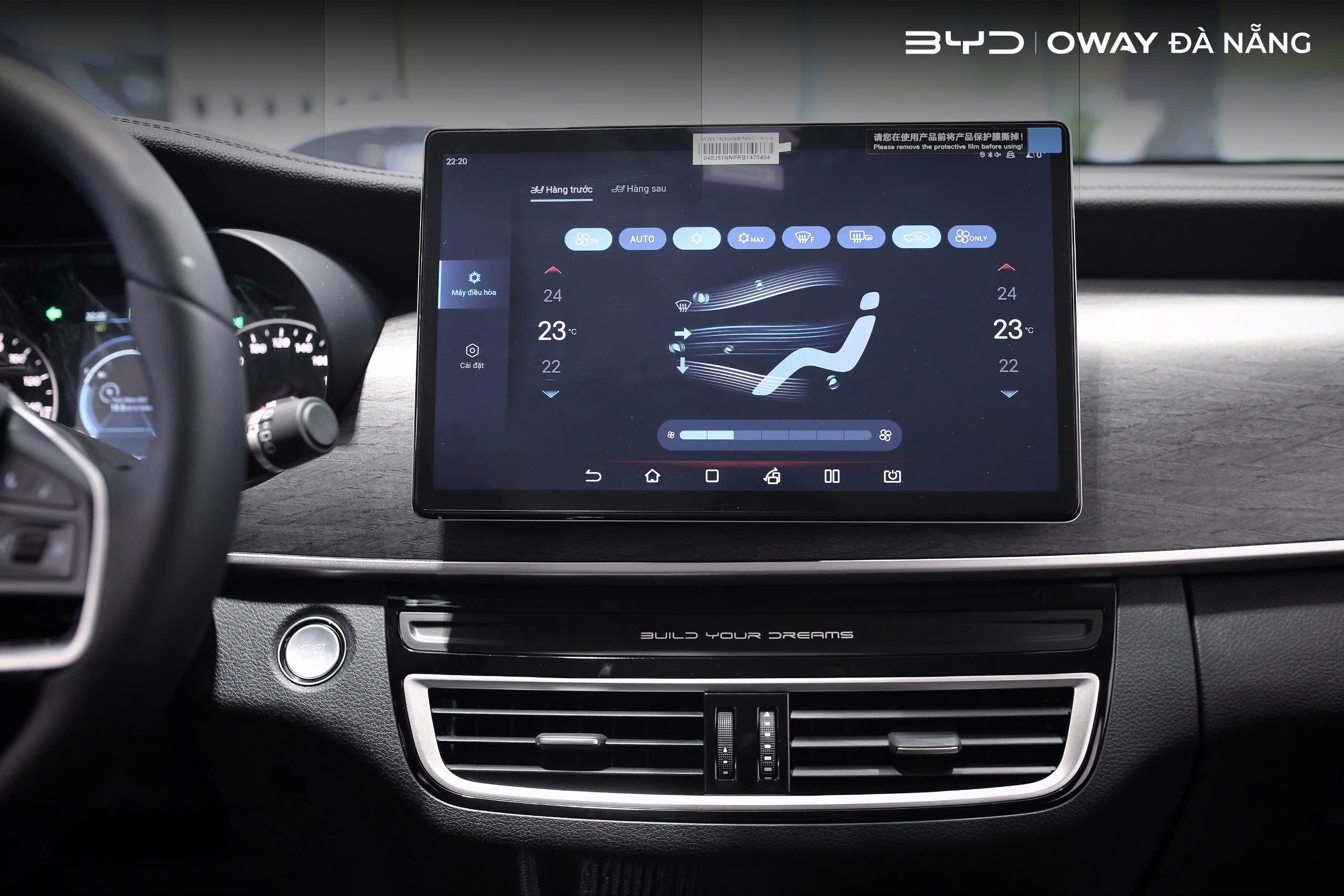 Trung tâm giải trí BYD M6 2025 tiếp tục là màn hình cảm ứng 12,8 inch với thiết kế xoay thông minh tương tự các dòng xe BYD ra mắt trước đây. Màn hình này cũng tích hợp hiển thị đa thông tin và hỗ trợ kết nối Apple CarPlay, Android Auto, USB, Bluetooth, trợ lý giọng nói, Radio FM…